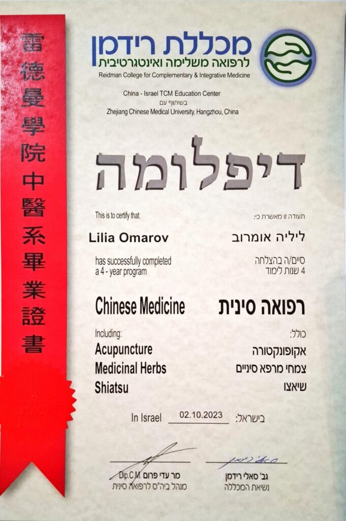 נעים להכיר, ליליה אופנשטיין, בת 34, בוגרת מכללת רידמן במסלול ה-4 שנתי של לימודי רפואה סינית ושיאצו.