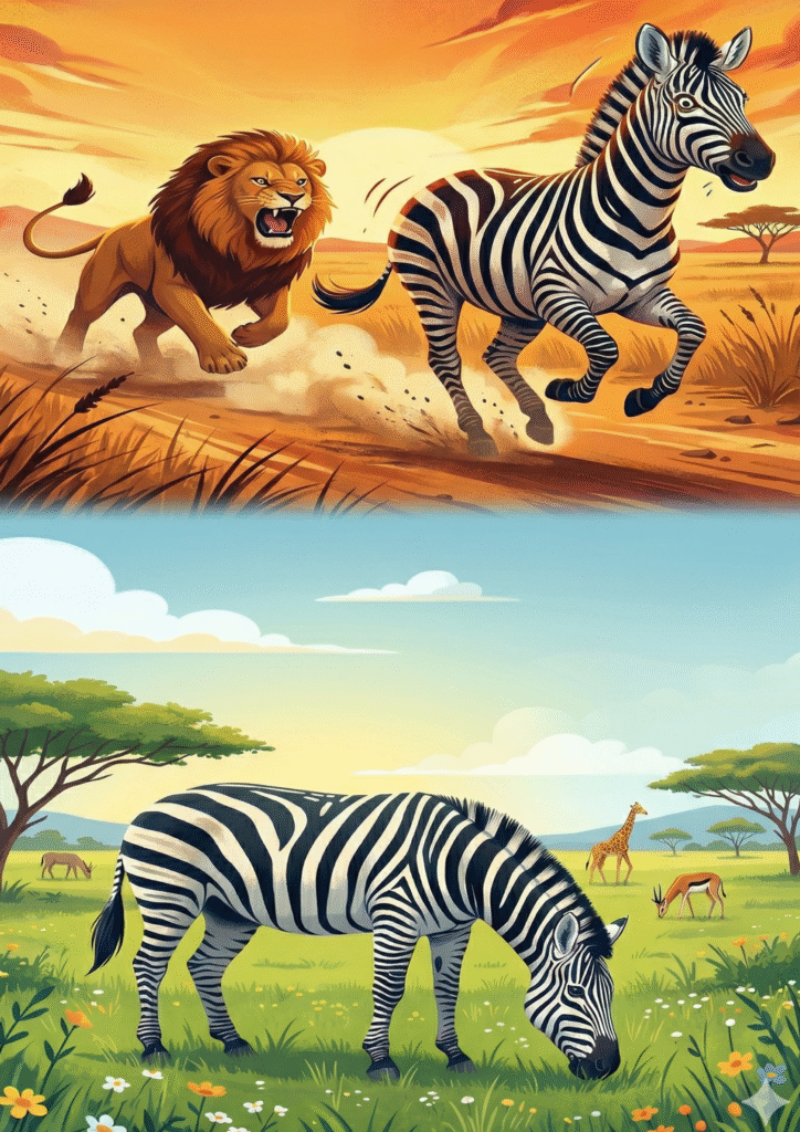 הזברה נסה על נפשה. למזלה, האריה התעייף והיא הצליחה לברוח. היא עוצרת, מסתכלת לצדדים, מבינה שהסכנה חלפה, ורועדת מעט כדי לפרוק את המתח. תוך דקות, המערכת הפארא-סימפתטית (מערכת ה"מנוחה ועיכול") נכנסת לפעולה: קצב הלב יורד, זרימת הדם חוזרת למעיים, והיא חוזרת ללחך עשב ברוגע.